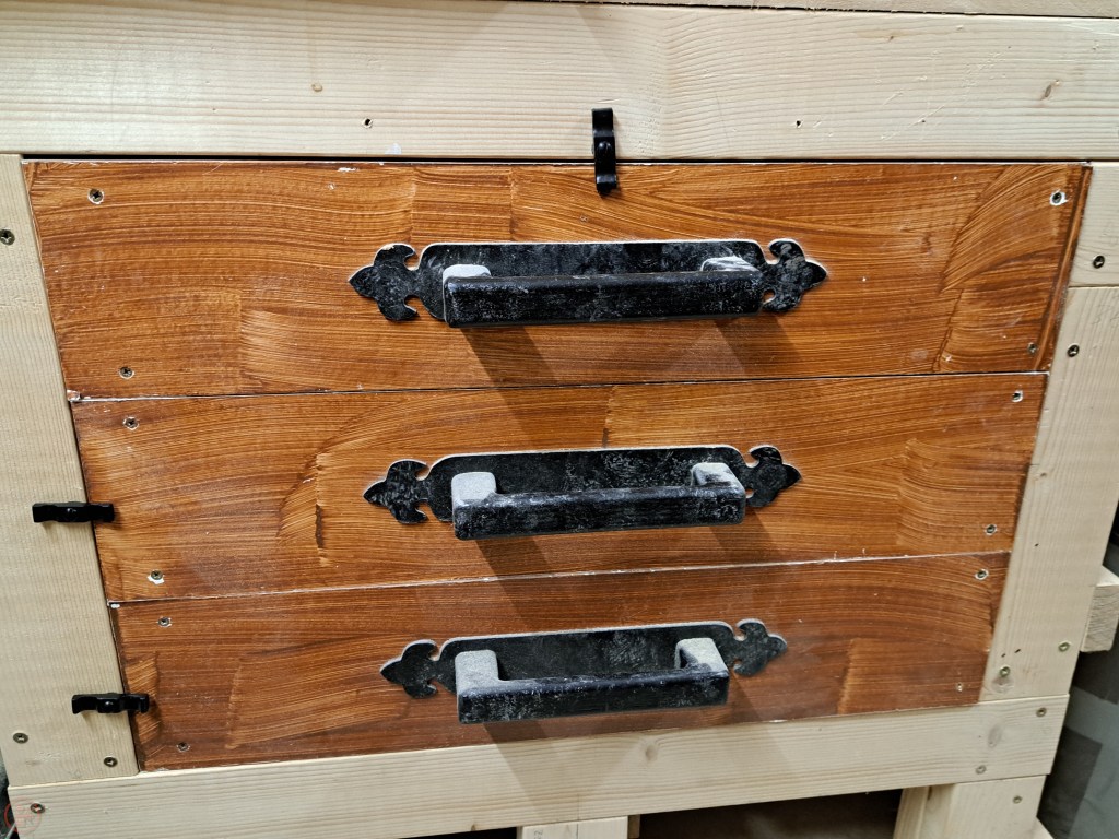 I secured five to the front of the mitre saw bench – one for each drawer – and am surprisingly pleased with the result. The catches don’t get in the way at all when not in use and allow the drawers to be held firmly shut. If needed I can always add additional catches to the right hand side of the lower drawers to provide a second holding point, but these should work very nicely for loading into the van for transport to the new workshop!🔨