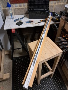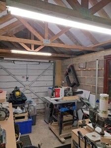 The garage only had a single overhead fluorescent light, about two thirds of the way in from the up-and-over door. This would be fine if I were only parking a car in here but definitely not enough light for woodworking! I started by mounting a second fluorescent light fitting to some pallet wood and then secured that to the rafters using zip ties (so I don’t make any damage). I secured the wiring along the top of the beam and then down to the plug sockets. This is the same light I had in the previous workshop on the wall and I’m pleased it survived the move ok!