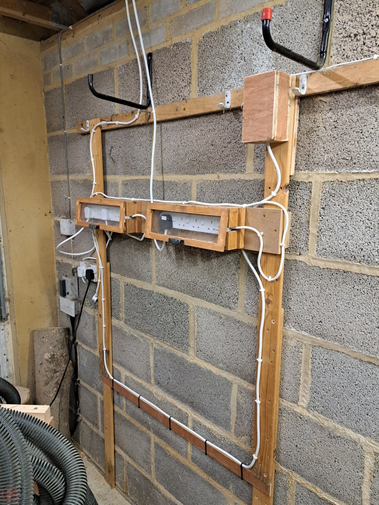 The layout for this workshop is slightly different from ones I’ve had before due to the pedestrian walk door allowing me to not have to open the main up-and-over door to get in. This means I have arranged the workshop around a central working area-space, rather than as a corridor from front to back, like in previous workshops. The challenge for this however is how to get power from the sockets on one side to the tools on the other!